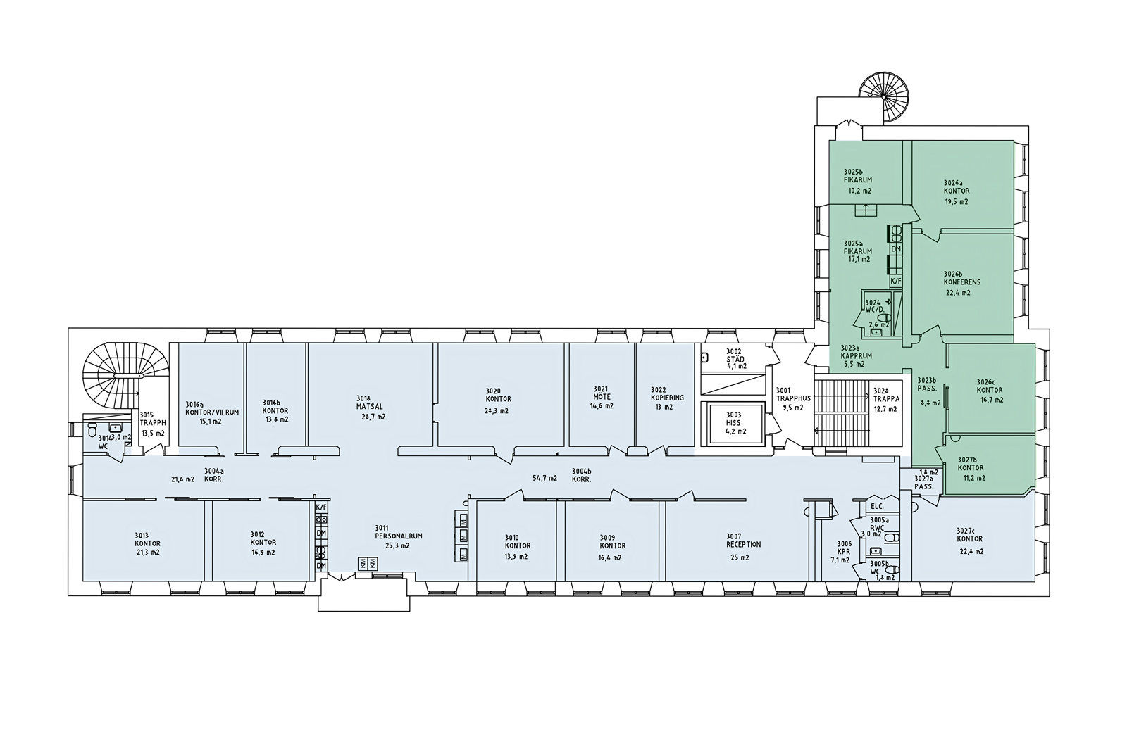 Det större rummen är generösa i sin storlek och rymmer därför med enkelhet flera arbetsplatser. I köket finns utrymme för matplats samt utgång till en balkong som tillhör lokalen. Från lokalen har du utsikt mot närliggande skogsområde och kringliggande byggnader. Fönstren har spröjs och breda fönsterbrädor i sten.